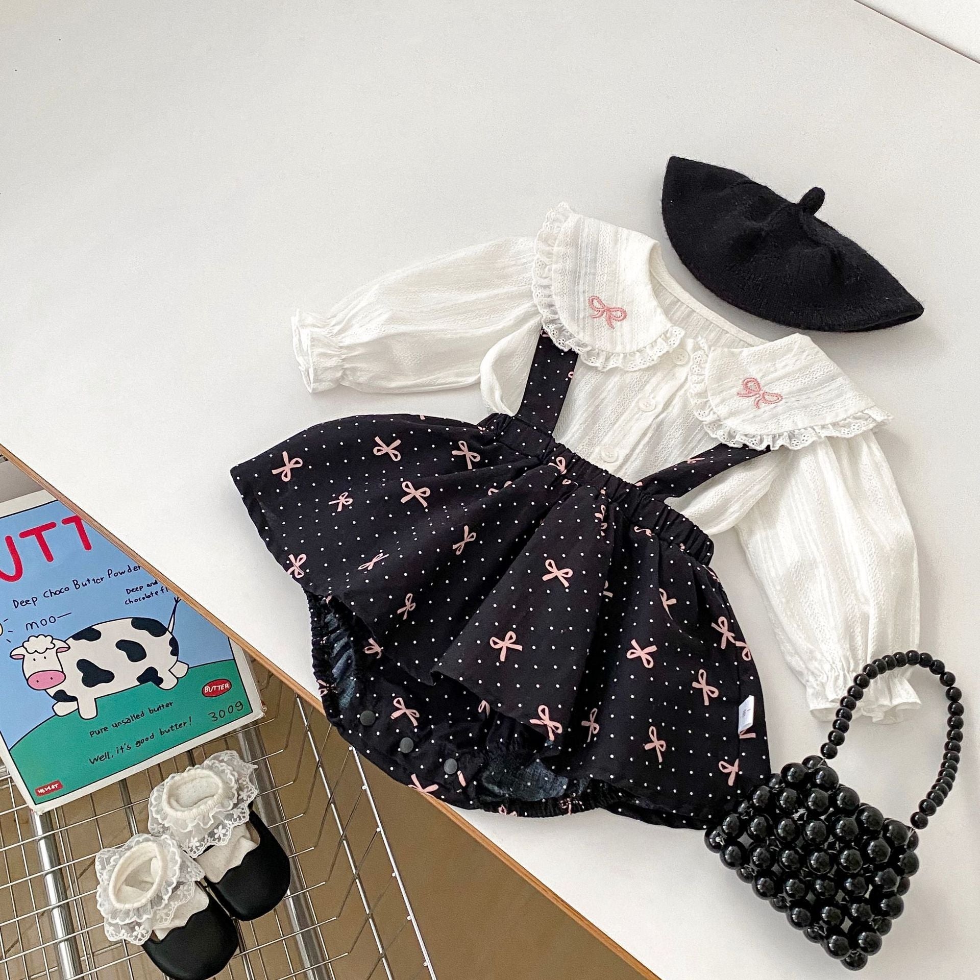 Introducing our exclusive Arrival Spring Girls set, featuring a delicate butterfly-bow embroidered collar and long sleeves for a touch of elegance. This premium clothing set includes both a top shirt and overalls skirt, perfect for the fashionable and sophisticated young girl. Elevate her wardrobe with this luxurious set.