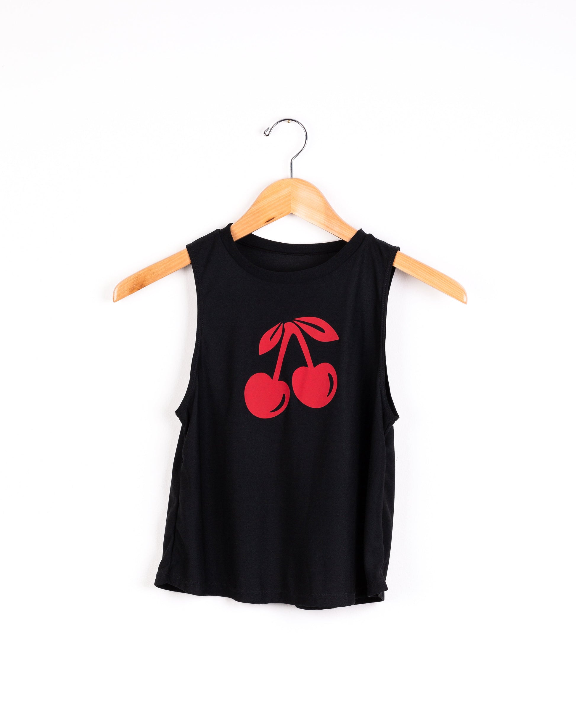 This cherries printed tank top is one of our bestsellers as it is designed with a loose shape and deep cut armhole slots. Perfect for warm-weather and sportif-chic activities. Round neckline.