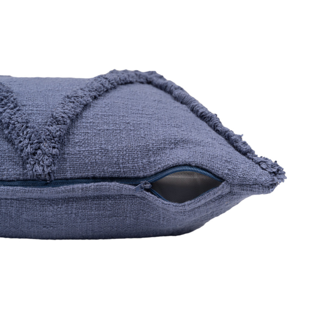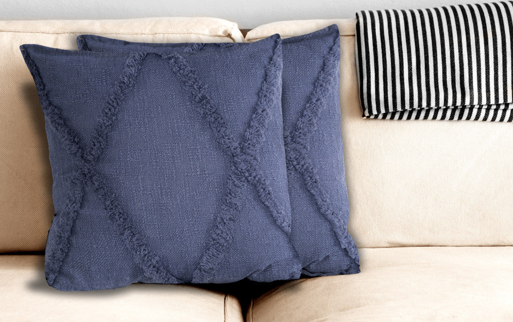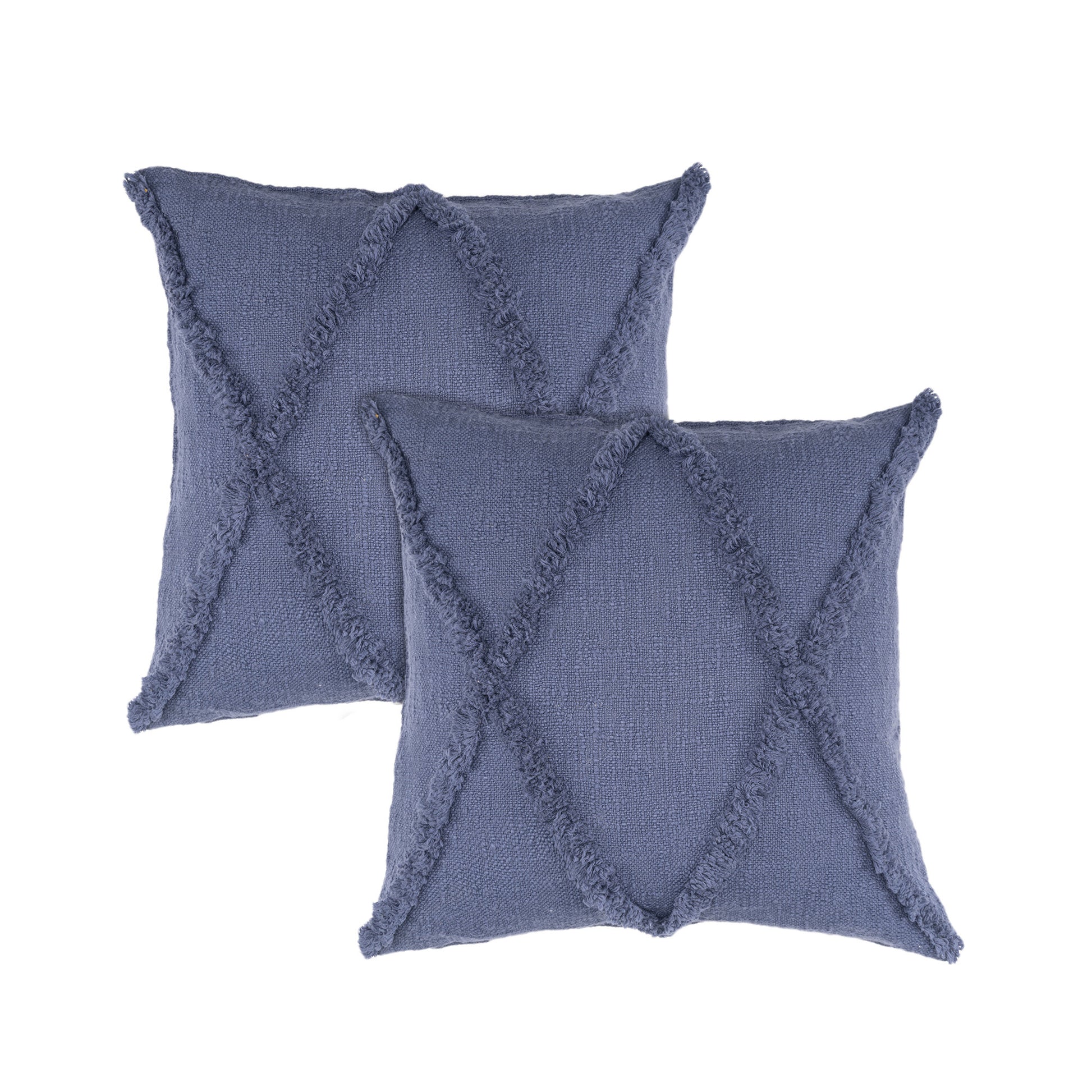 Bring a bit of fashion and zip to your space with this eye-catching and comfy set of two blue geometric cotton throw pillow with fringe. Ultra durable blue denim colored cotton has been used to make this decorative pillow set a beautiful look that will stand the test of time. For anyone that loves to decorate or accent their space with color and texture. Decorative pillows are a great way to change up the look and feel of your space easily and quickly. 18-inch H x 18-inch W x 4-inch D
