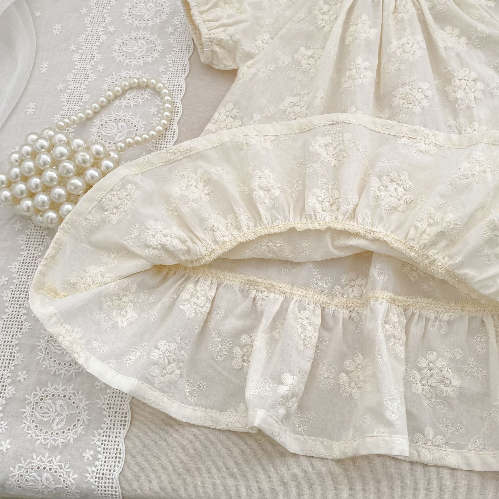 Summer Girls Solid Color Flowers Embroidery Short Sleeves Onesies and Girls’ Dress – Princess Sister Matching Set